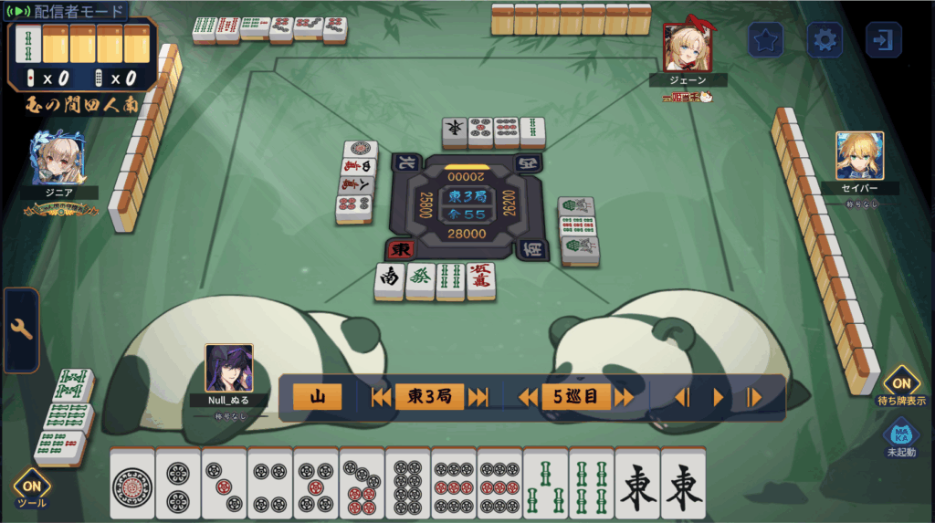 対面・上家ともに染め手気配。出てきたダブ東を鳴くかどうか。