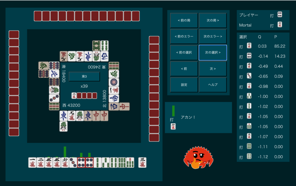Mortalは6萬か4筒の選択で、大差で6萬切り推奨でした。